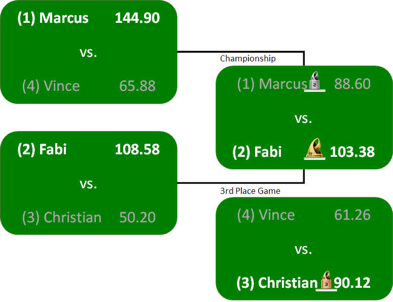 2014 | 16 | Christian ![]() | Christian | Christian,Vince | 90.12 | vs. | 61.26 | Vince | Vince | Vince,Christian | 3rd Place Game |