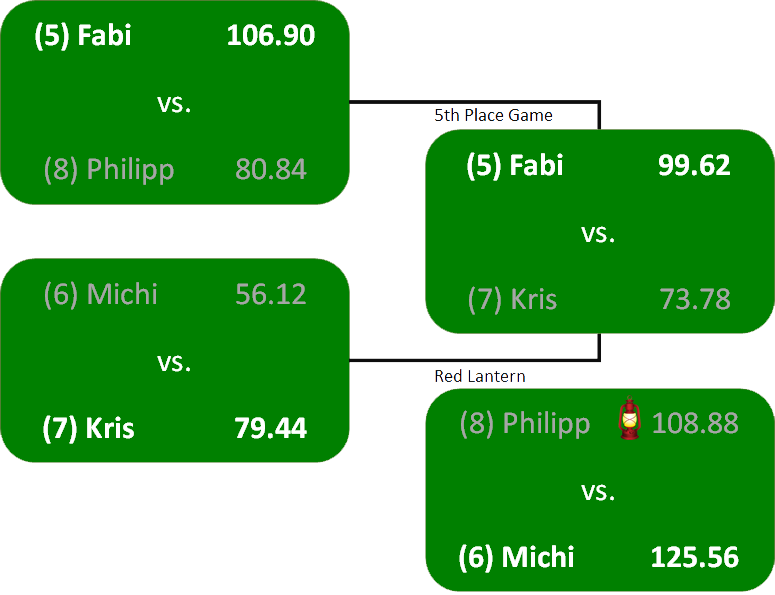 2016 | 16 | Michi | Michi | Michi,Philipp | 125.56 | vs. | 108.88 | Philipp ![]() | Philipp | Philipp,Michi | Red Lantern |