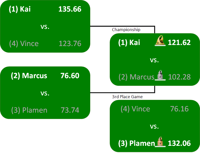 2016 | 16 | Vince | Vince | Vince,Plamen | 76.16 | vs. | 132.06 | Plamen ![]() | Plamen | Plamen,Vince | 3rd Place Game |