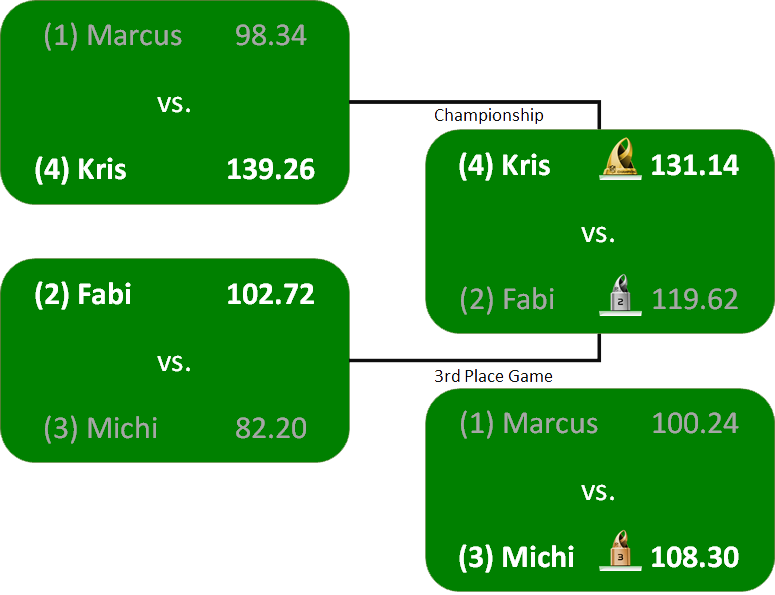 2018 | 16 | Michi ![]() | Michi | Michi,Marcus | 108.30 | vs. | 100.24 | Marcus | Marcus | Marcus,Michi | 3rd Place Game |