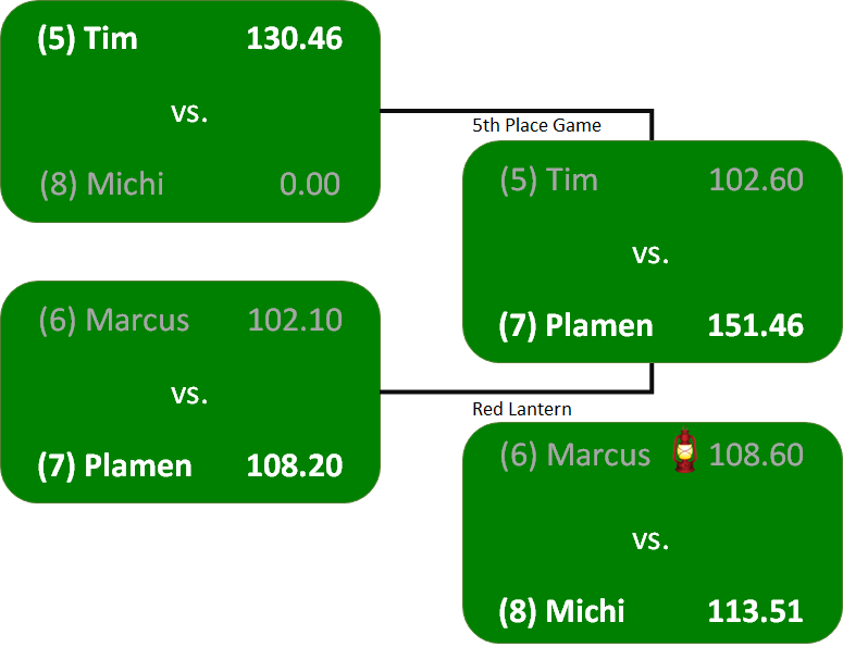 2022 | 17 | Marcus ![]() | Marcus | Marcus,Michi | 108.60 | vs. | 113.51 | Michi | Michi | Michi,Marcus | Red Lantern |