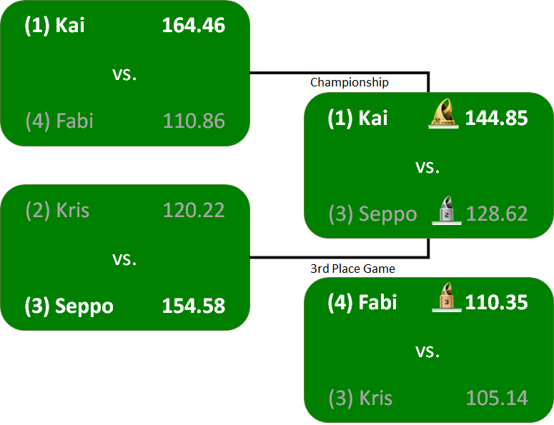 2022 | 17 | Kris | Kris | Kris,Fabi | 105.14 | vs. | 110.35 | Fabi ![]() | Fabi | Fabi,Kris | 3rd Place Game |